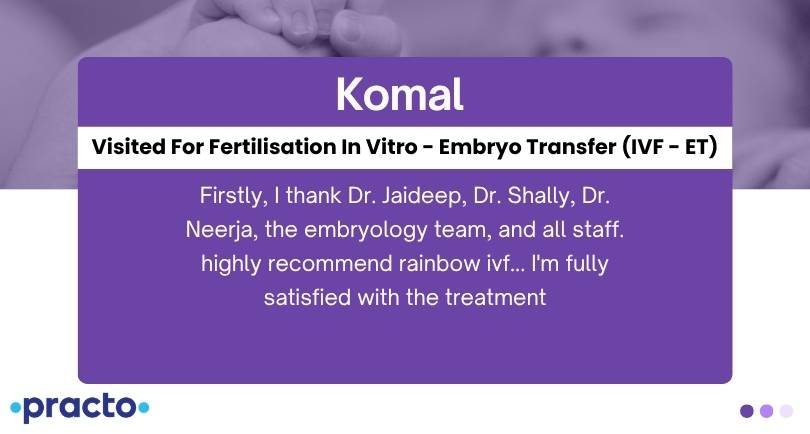 Excellent service ,the environment is very calm and peaceful..Dr jaideep and the staff is very supportive,they listen our queries and sincerely give answer to every question. ..I got the result within a month ...I thanks to God that we connect to Rainbow....